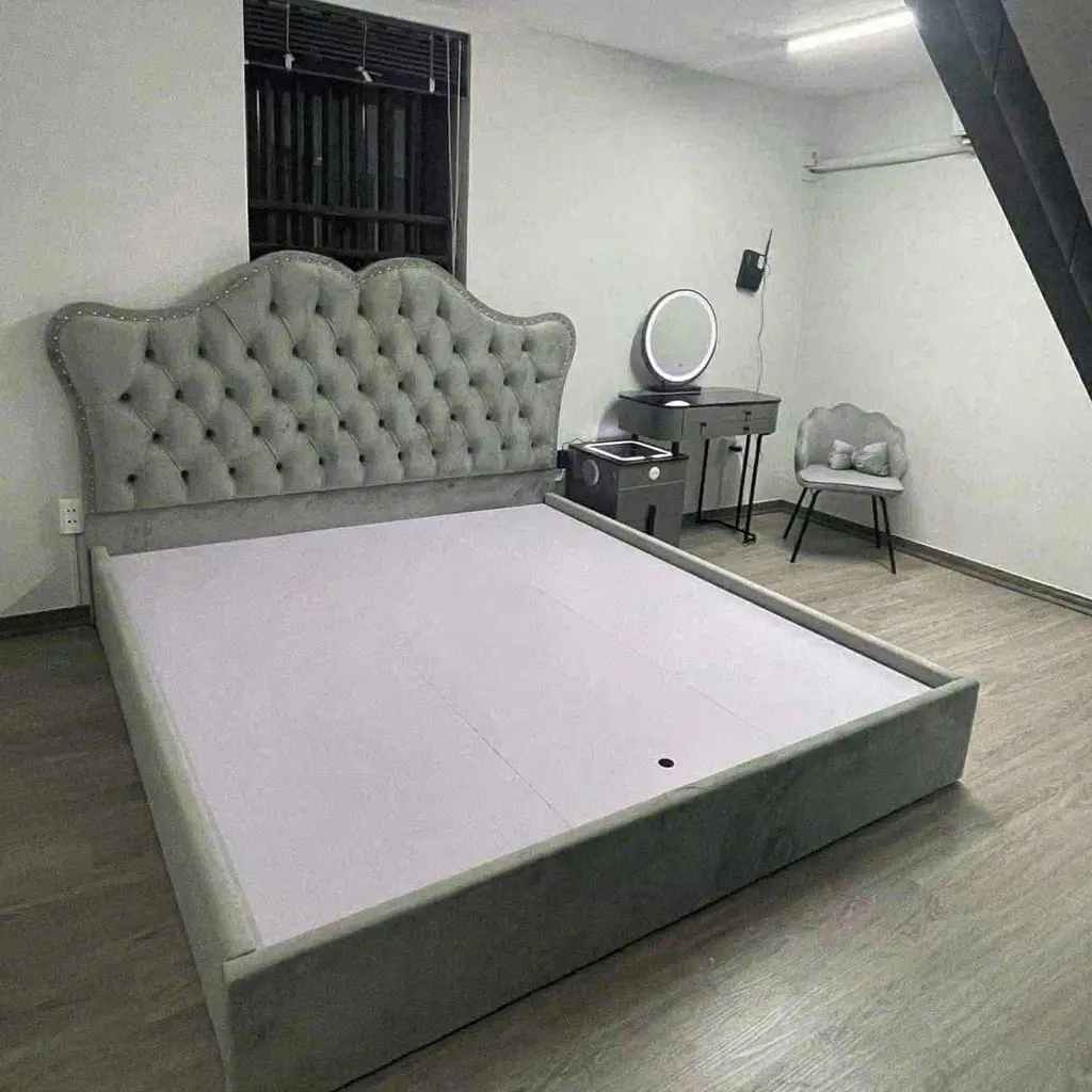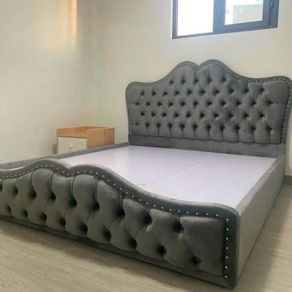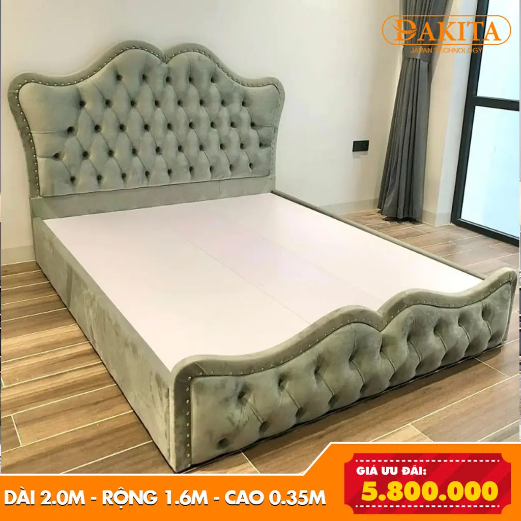 – Chân giường ngủ bọc nỉ thấp lại được làm bằng chất liệu gỗ tự nhiên giúp giường thêm sự vững vàng hơn; tạo chỗ nằm thư giãn thật thoải mái và chắc chắn cho gia chủ khi ngủ nghĩ, thư giãn. Đầu giường được thiết kế dạng vòm, bọc nệm kết hợp chần nút (rút múi) đây là kiểu thường thấy trong các giường tân cổ điển gây ấn tượng bởi vẻ đẹp đặc biệt tinh tế, sang trong cho chiếc giường ngủ khi bày trí bên trong không gian nội thất.