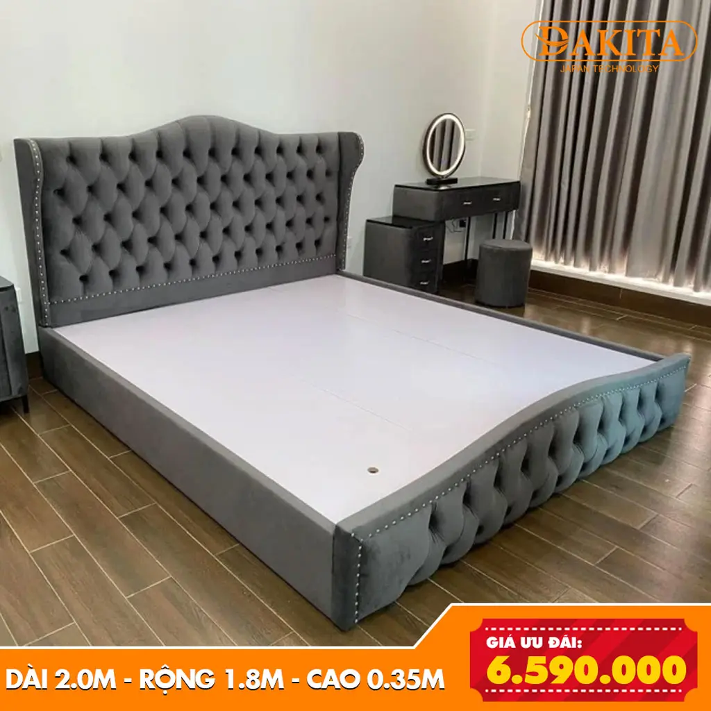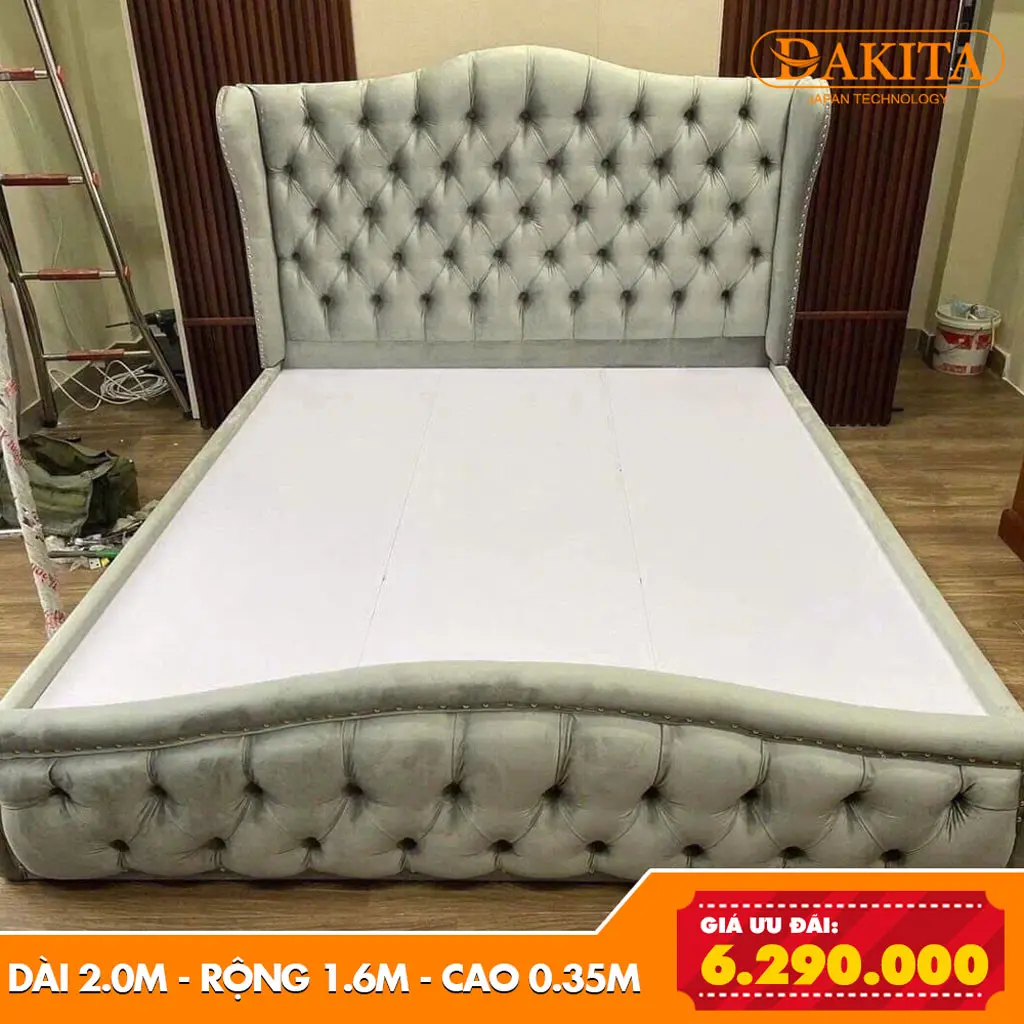 – Chân giường ngủ bọc nỉ thấp lại được làm bằng chất liệu gỗ tự nhiên giúp giường thêm sự vững vàng hơn; tạo chỗ nằm thư giãn thật thoải mái và chắc chắn cho gia chủ khi ngủ nghĩ, thư giãn. Đầu giường được thiết kế dạng vòm, bọc nệm kết hợp chần nút (rút múi) đây là kiểu thường thấy trong các giường tân cổ điển gây ấn tượng bởi vẻ đẹp đặc biệt tinh tế, sang trong cho chiếc giường ngủ khi bày trí bên trong không gian nội thất.