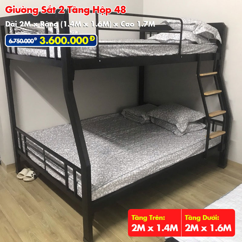 Kích thước : Tầng trên rộng 1.4m , tầng dưới rộng 1.6m. Chiều dài 2m (cả phủ bì).