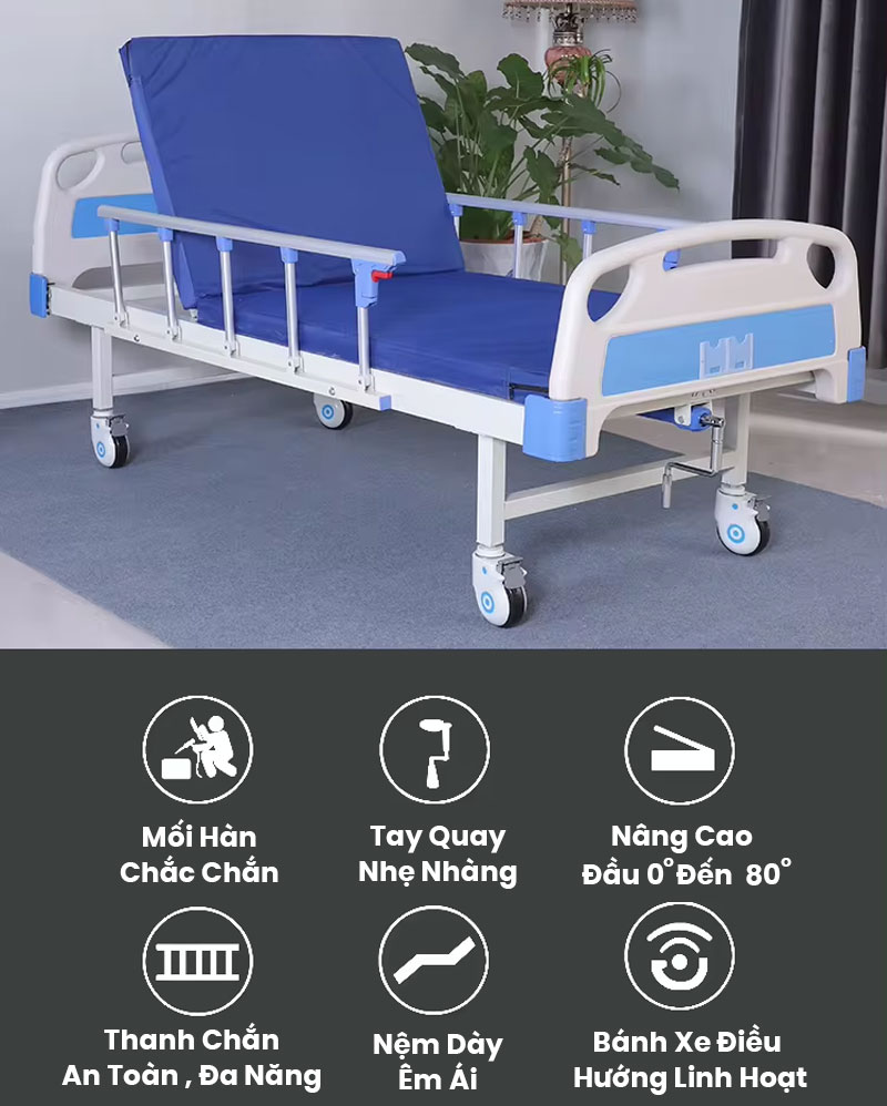 – Nâng đầu và hạ đầu từ 0 đến 80 độ. Tay quay hoạt động theo từng chế độ riêng biệt.