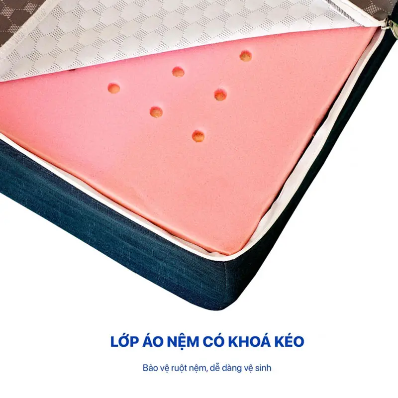 - Vải gấm xốp cao cấp cho phép không khí lưu thông, giúp nệm luôn thoáng mát và dễ chịu suốt đêm. Bao quanh viền là vải gấm chắc chắn.