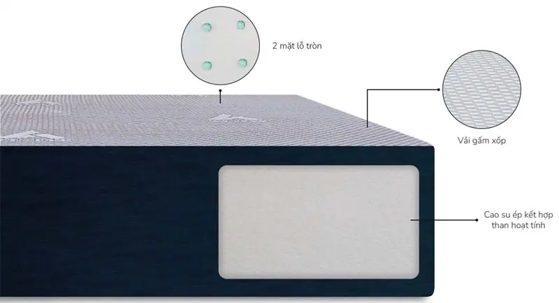 - Kết hợp cao su ép và than hoạt tính, mang lại độ đàn hồi vượt trội và khả năng kháng khuẩn hiệu quả. Than hoạt tính giúp kiểm soát mùi và ngăn ngừa vi khuẩn, bảo vệ sức khỏe người sử dụng.