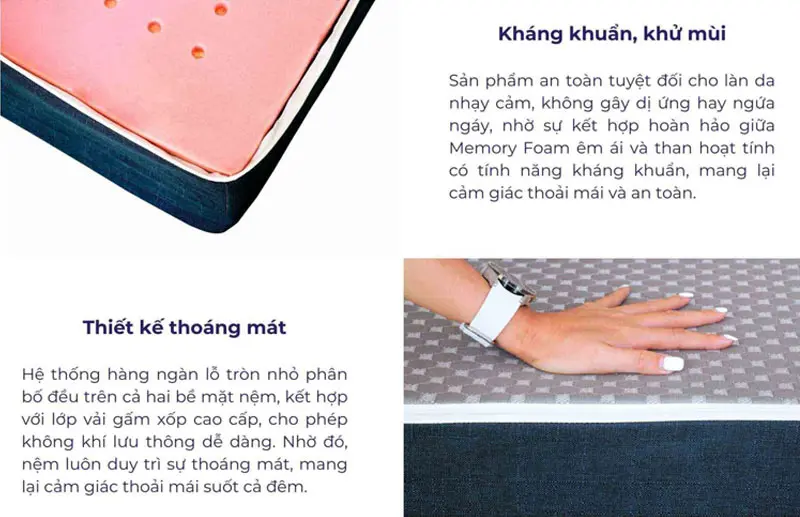 - Hệ thống lỗ thông minh trên cả hai mặt giúp giảm cảm giác bí hơi và tạo sự thoải mái cho người nằm.