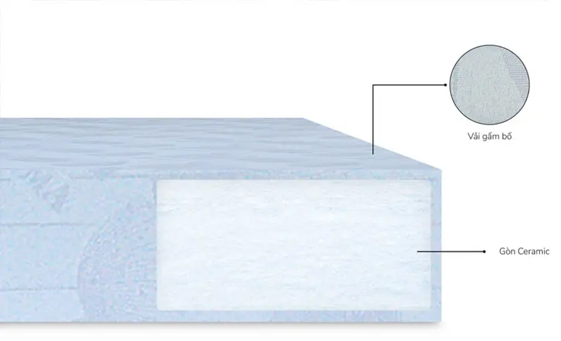 Nệm sử dụng chất liệu gòn Ceramic (bông ceramic) với khả năng cách nhiệt vượt trội, độ bền cao và khả năng chịu nén xuất sắc. Công nghệ ép hiện đại giúp nệm chắc chắn, mang đến sự kết hợp hoàn hảo giữa sự thoải mái và độ bền lâu dài. Đây là một sản phẩm không chỉ đảm bảo chất lượng mà còn an toàn cho sức khỏe người sử dụng.
