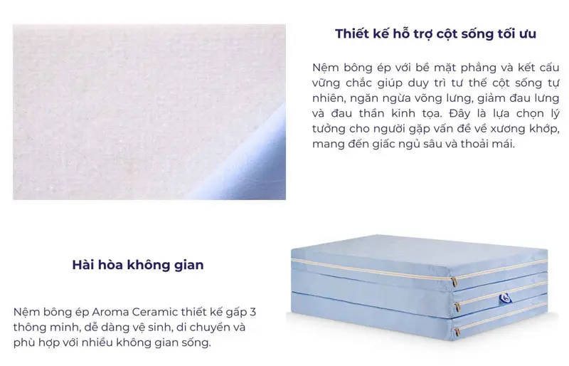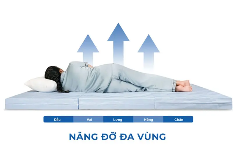 - Tiết kiệm không gian: Thiết kế gấp 3 linh hoạt giúp bạn dễ dàng bảo quản và di chuyển nệm, phù hợp cho các căn phòng có diện tích hạn chế.