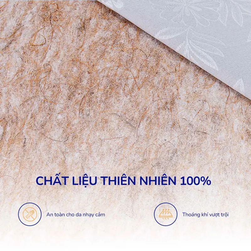 Chất liệu tự nhiên an toàn: Sử dụng 100% bông sợi xơ dừa thiên nhiên, đã qua xử lý khử trùng và diệt khuẩn, hạn chế sự xâm nhập của mối mọt và côn trùng, đảm bảo an toàn cho sức khỏe người dùng.