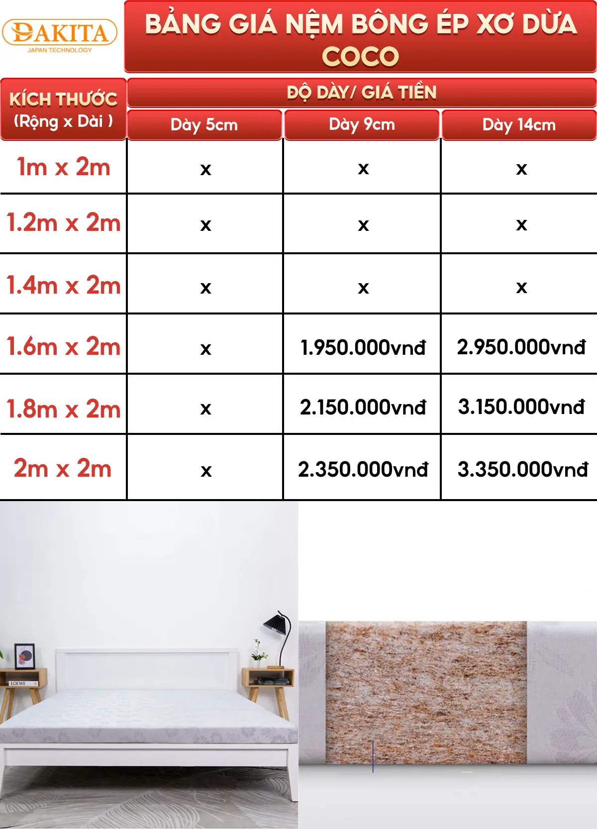 Kích thước: Có nhiều kích thước để lựa chọn, phổ biến như 160x200x9cm, 180x200x9cm, 160x200x14cm, 180x200x14cm.