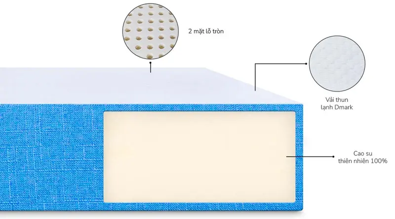 Sản phẩm được chế tác từ 100% cao su thiên nhiên với quy trình xử lý nghiêm ngặt, không chứa hóa chất độc hại. Cấu trúc lỗ thoáng khí giúp lưu thông không khí tối ưu, hạn chế tình trạng hầm bí và duy trì sự thoáng mát suốt đêm. Lớp lưới mỏng bên trong nệm đóng vai trò như “lá chắn” bảo vệ, ngăn ngừa sự xâm nhập của vi khuẩn, nấm mốc và các tác nhân gây dị ứng từ môi trường.