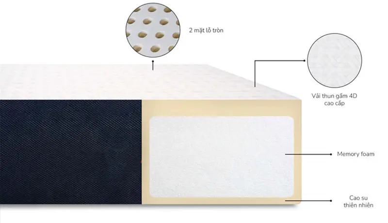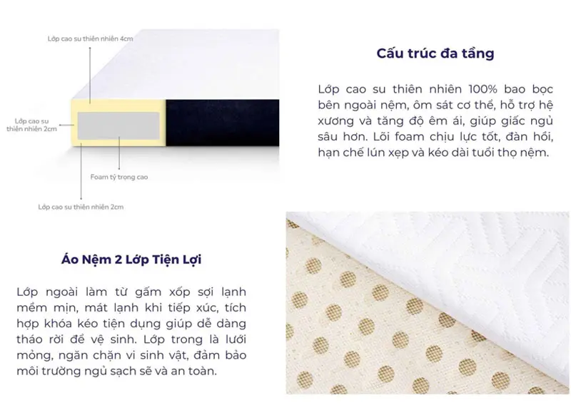 Bao bọc toàn bộ thành nệm với độ dày 2cm. Mặt trên có lớp cao su dày 4cm, trong khi mặt dưới dày 2cm. Cao su thiên nhiên không chỉ đảm bảo độ đàn hồi tối ưu mà còn duy trì độ bền vượt thời gian. - Lõi foam bên trong: