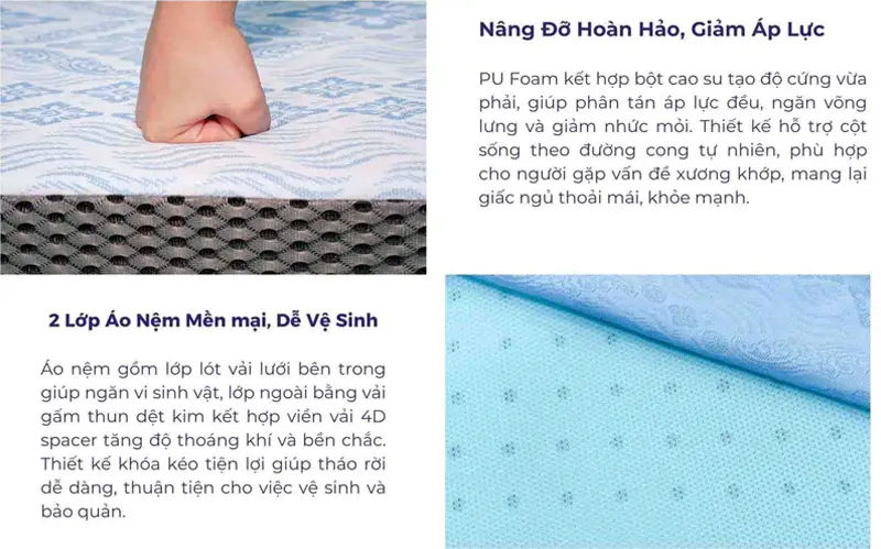 - Lớp lót lưới bên trong: Ngăn chặn vi sinh vật xâm nhập, giữ nệm sạch sẽ lâu dài.