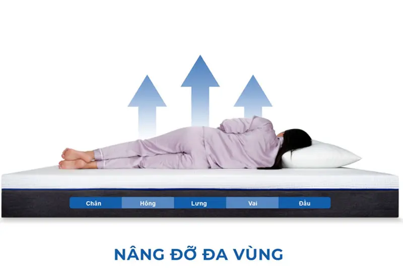 - Lớp Memory Foam: Ôm sát cơ thể, giảm áp lực lên các điểm tiếp xúc như vai, hông và lưng, mang lại cảm giác thư giãn tối đa.