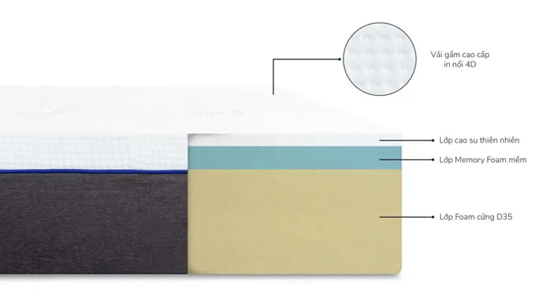 - Lớp Foam cứng D35: Nâng đỡ cơ thể, giữ cột sống thẳng, bền bỉ và không bị xẹp lún theo thời gian.
