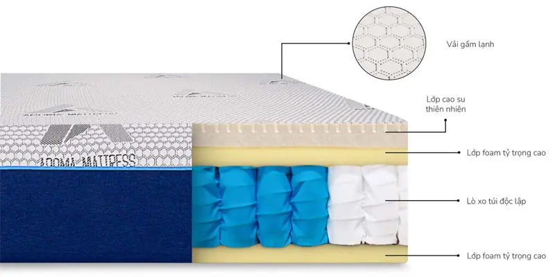 Hệ thống lò xo túi độc lập làm từ thép nhập khẩu, đảm bảo độ bền vượt trội và khả năng cách ly chuyển động tối ưu. Các chuyển động được triệt tiêu ngay lập tức, giữ giấc ngủ không bị gián đoạn. Lớp foam siêu êm và cao su thiên nhiên với hàng ngàn lỗ thoáng khí mang lại cảm giác mát mẻ, dễ chịu trong suốt đêm.