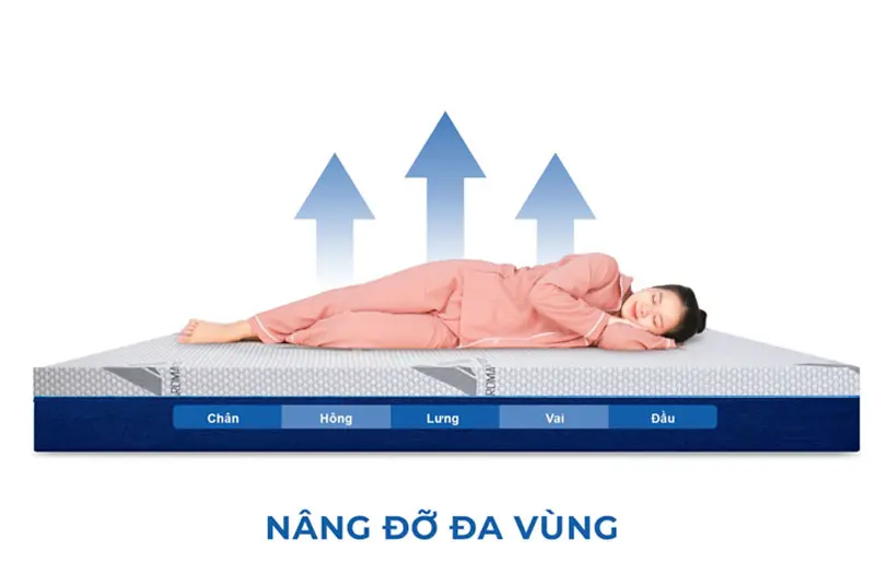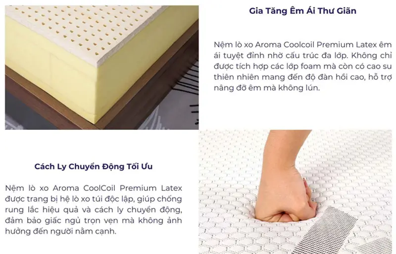 - Thoáng khí vượt trội: Lớp cao su thiên nhiên thoáng mát cùng áo nệm vải gấm lạnh đảm bảo sự dễ chịu, không gây bí bách.