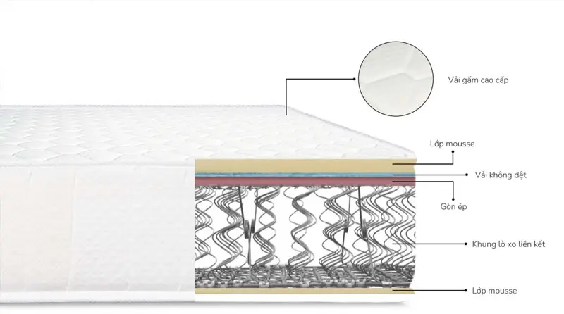 Hệ thống lò xo liên kết dạng hình trống làm từ thép cao cấp giúp nệm chịu lực tốt, giảm rung lắc và hạn chế tiếng động không mong muốn. Đặc biệt, các lò xo trợ lực được bố trí dọc khung nệm mang lại sự vững chắc vượt trội, đồng thời tăng khả năng chịu lực ở các điểm trọng yếu.