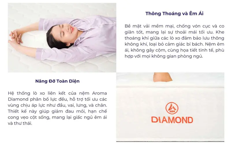 Với công nghệ tiên tiến, thiết kế vượt trội và khả năng nâng đỡ hoàn hảo, Nệm Lò Xo Aroma Diamond là sự lựa chọn lý tưởng cho giấc ngủ thoải mái, giúp bạn tái tạo năng lượng mỗi ngày.