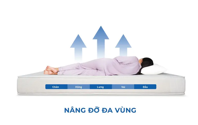 - Nâng đỡ tối ưu: Hệ thống lò xo và mousse lót tỷ trọng cao hỗ trợ toàn bộ cơ thể, giảm căng thẳng tại các vùng cổ, lưng, vai và chân.