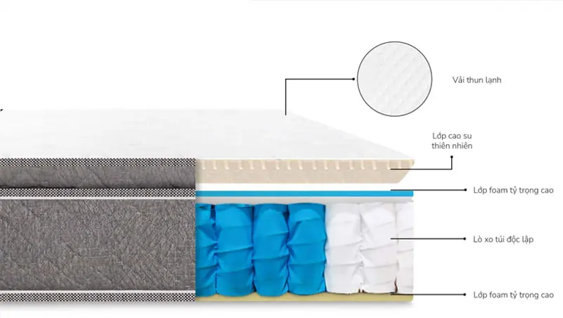Hệ thống lò xo túi độc lập hình trụ xoắn đều giúp chống rung lắc hiệu quả, không làm ảnh hưởng đến người nằm cạnh khi có sự chuyển động. Khung lò xo được làm từ thép cao cấp đạt tiêu chuẩn Châu Âu, đảm bảo độ bền và đàn hồi tuyệt vời. Lớp lót nệm được trang bị lớp bông polyeste dày và foam siêu đàn hồi, tạo cảm giác bồng bềnh, êm ái.