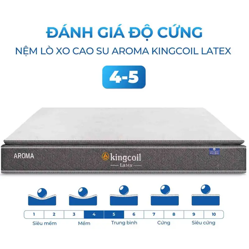 Nệm lò xo cao su Aroma Kingcoil Latex nổi bật với thiết kế hiện đại, cao 32cm và được cấu tạo vững chắc với ba viền chắc chắn, đảm bảo độ bền cao theo thời gian. Bề mặt nệm có lớp cao su thiên nhiên 100% dày 5cm, mang đến cảm giác êm ái và mát mẻ, hoàn hảo cho giấc ngủ sâu.