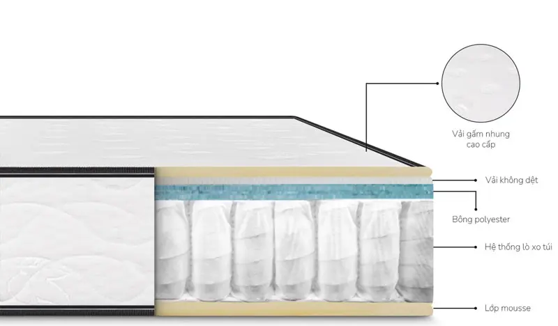 - Hệ thống lò xo túi độc lập: Giúp cách ly chuyển động, giảm rung lắc và đảm bảo sự ổn định tối đa, mang lại giấc ngủ êm đềm và không bị gián đoạn.