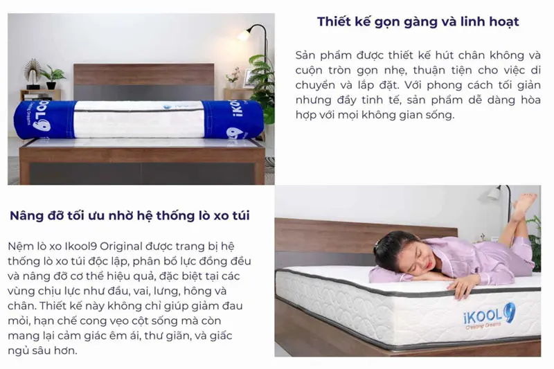Sản phẩm ứng dụng công nghệ lò xo túi độc lập được chế tạo từ thép cac-bon cao cấp, trải qua quá trình tôi điện cao tần để đạt độ bền và độ đàn hồi tối ưu. Hệ thống lò xo này giúp cách ly chuyển động và giảm rung lắc, mang lại giấc ngủ yên tĩnh ngay cả khi người nằm cạnh xoay trở. Thiết kế ép chân không hiện đại giúp nệm dễ dàng cuộn gọn, tiện lợi cho việc vận chuyển mà không làm ảnh hưởng đến chất lượng.