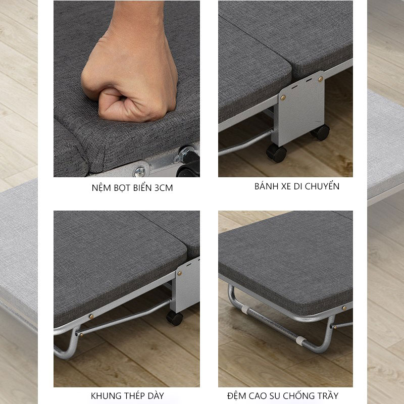 Ưu điểm: Nệm nằm êm, ngủ ngon, nhẹ, thiết kế cơ động đa năng, có thể gấp thành ghế ngồi hoặc gấp gọn khi không sử dụng, GIÁ RẺ