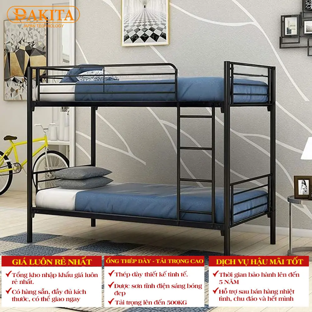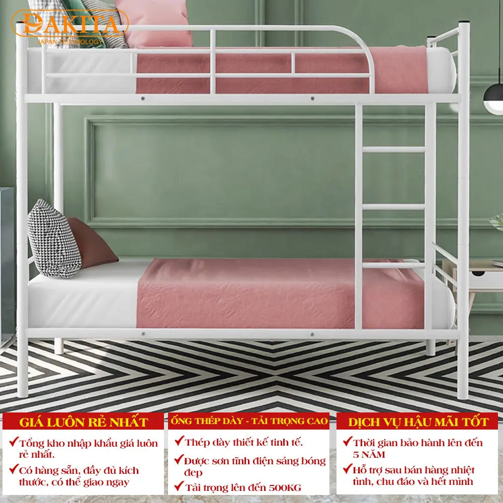 Giường sắt 2 tầng DAKITA đa dạng kích thước sẽ làm cho không gian phòng ngủ của bạn sẽ sang trọng và tiện nghi hơn. Bạn có thể thoải mái ngả lưng trên chiếc giường sang trọng mang lại cho bạn giấc ngủ sâu và thoải mái. Chiếc giường rất phù hợp với không gian ký túc xá và khu công nghiệp. Ngoài ra, bạn còn có thể chọn cho mình những mẫu nội thất văn phòng và gia đình đẹp.