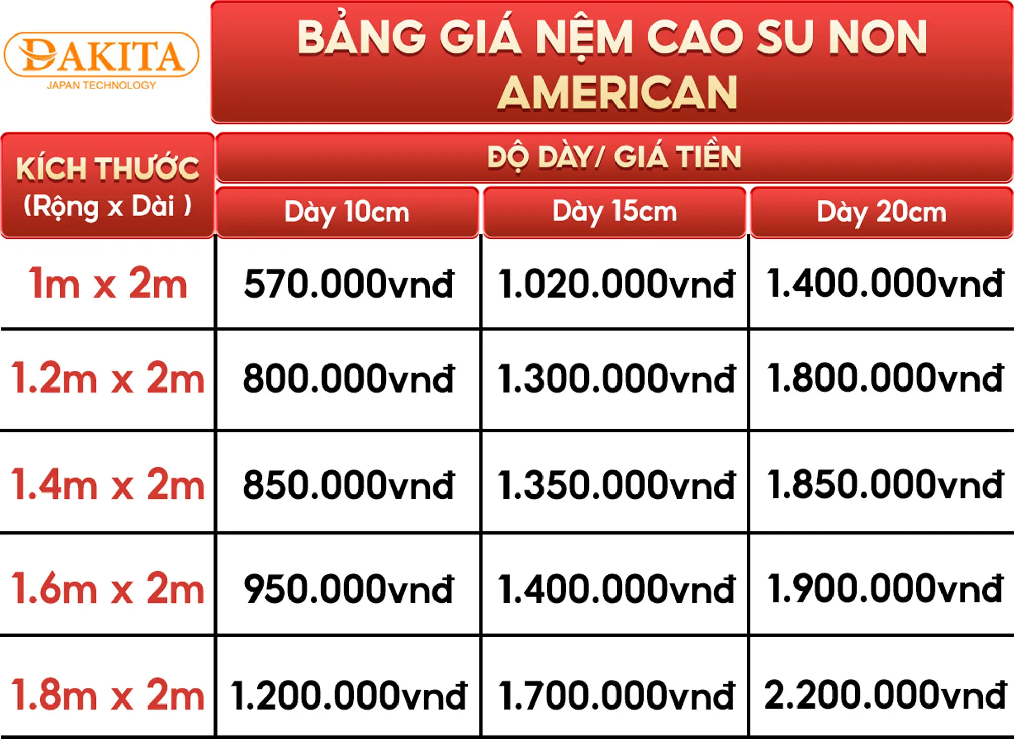 Kích thước (D x R x C): Dài 2m x Rộng 1.8m x Dày 10cm