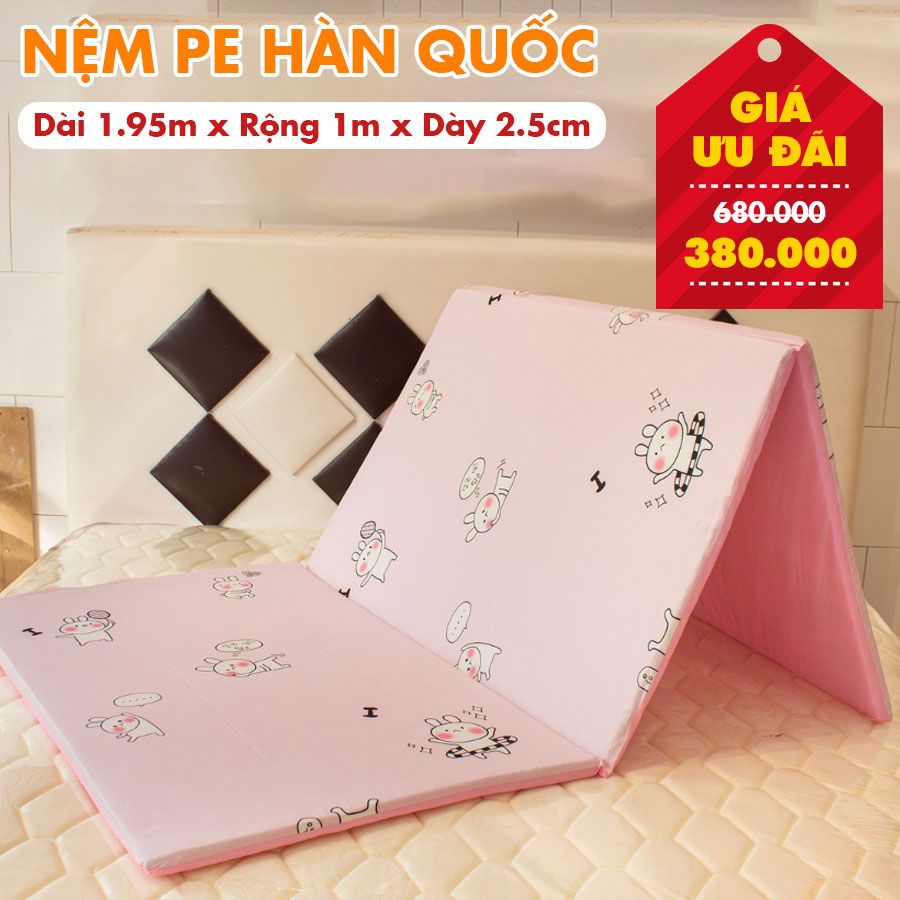 Với kết cấu 3 tấm linh hoạt, Nệm PE Hàn Quốc có thể gấp lại, sử dụng như sofa, nhẹ nhàng, dễ bảo quản và di chuyển, tiết kiệm không gian cho gia đình bạn.
