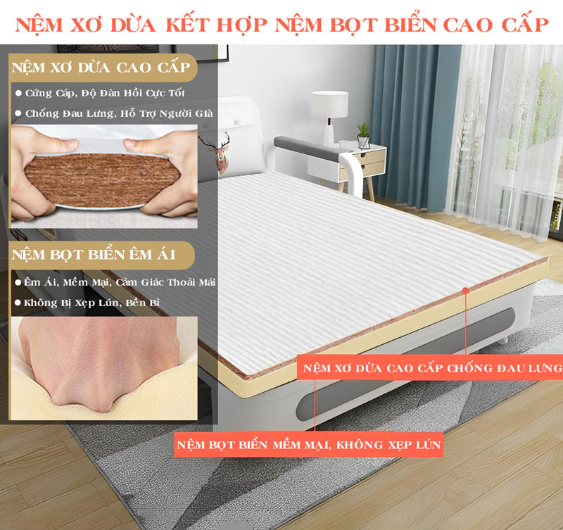 – Chất liệu đệm: Đệm bọt biển mềm êm kết hợp với đệm xơ dừa chuyên dùng cho y tế giúp nằm thẳng lưng chống đau lưng.