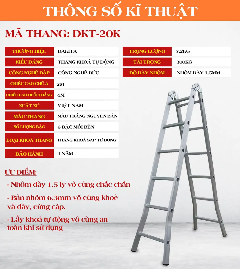 Tên sản phẩm: Thang Nhôm Chữ A Khóa Tự Động DAKITA DKT-20K