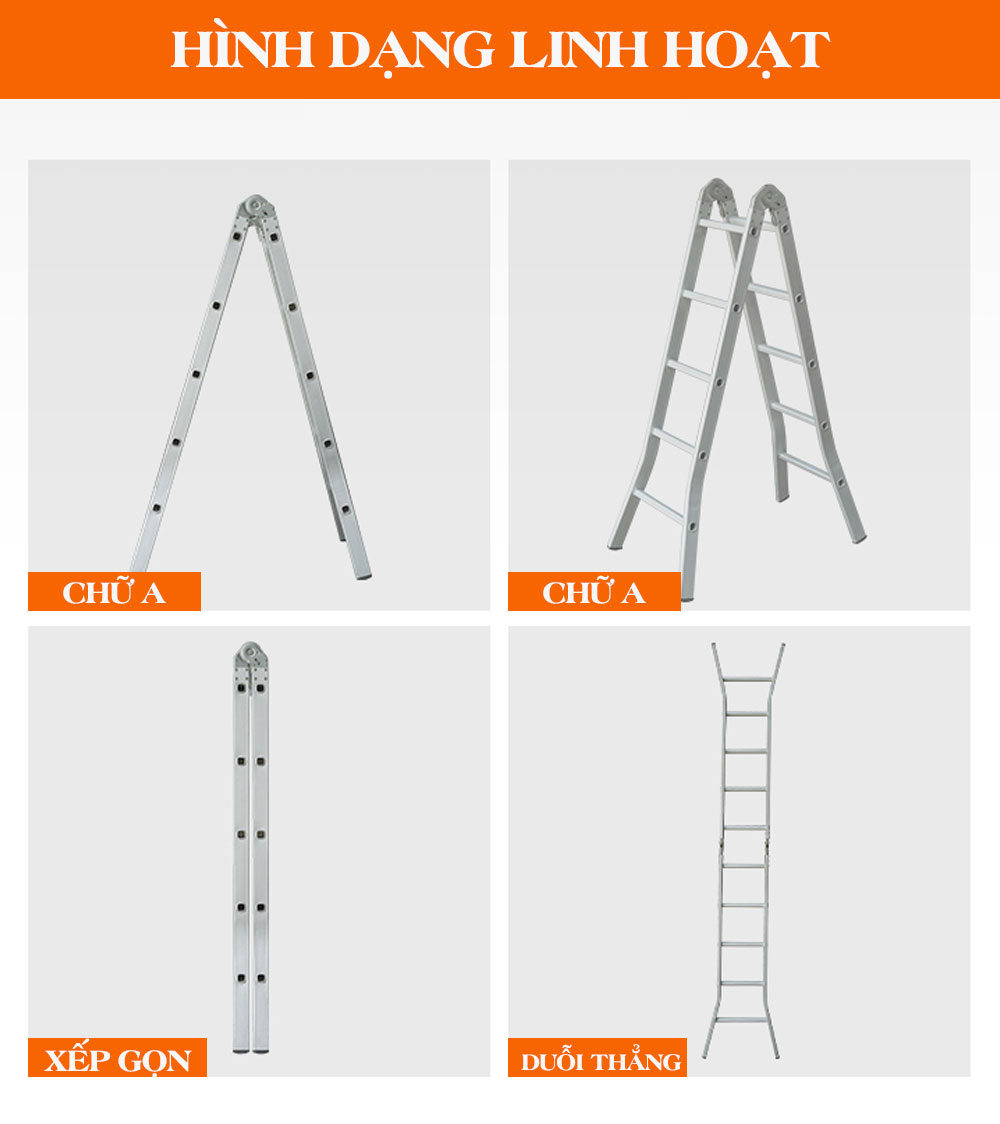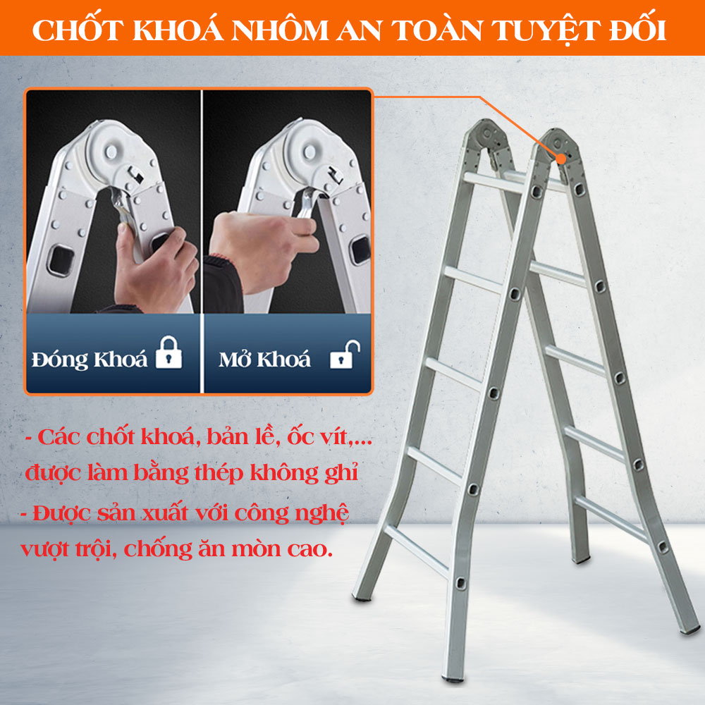 – Kiểu dáng: Thang nhôm chữ A có khóa tự động đa năng, vừa sử dụng chữ A, vừa có thể duỗi thẳng chữ I