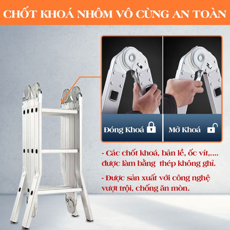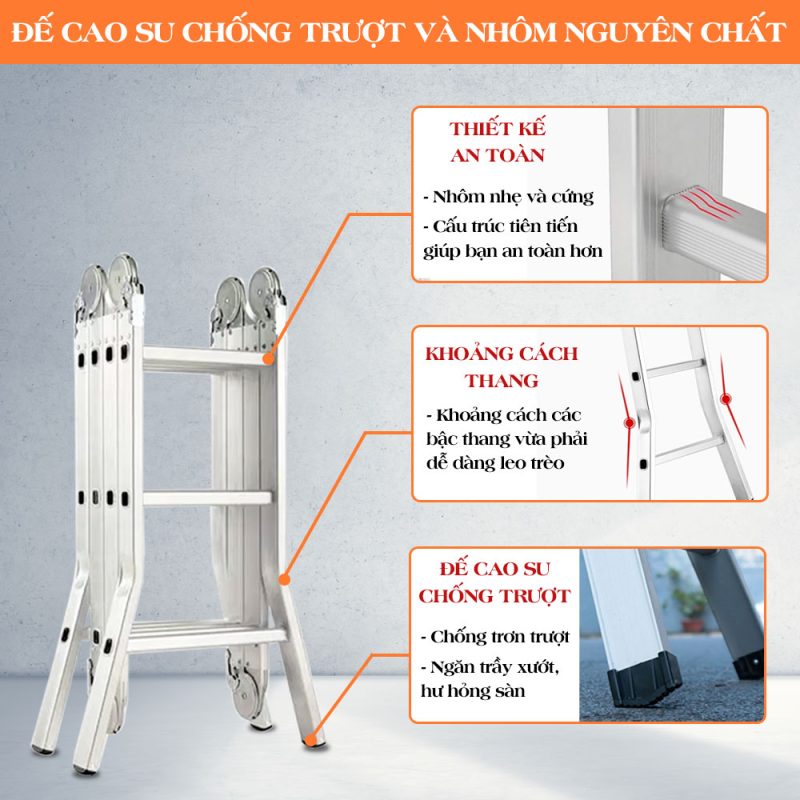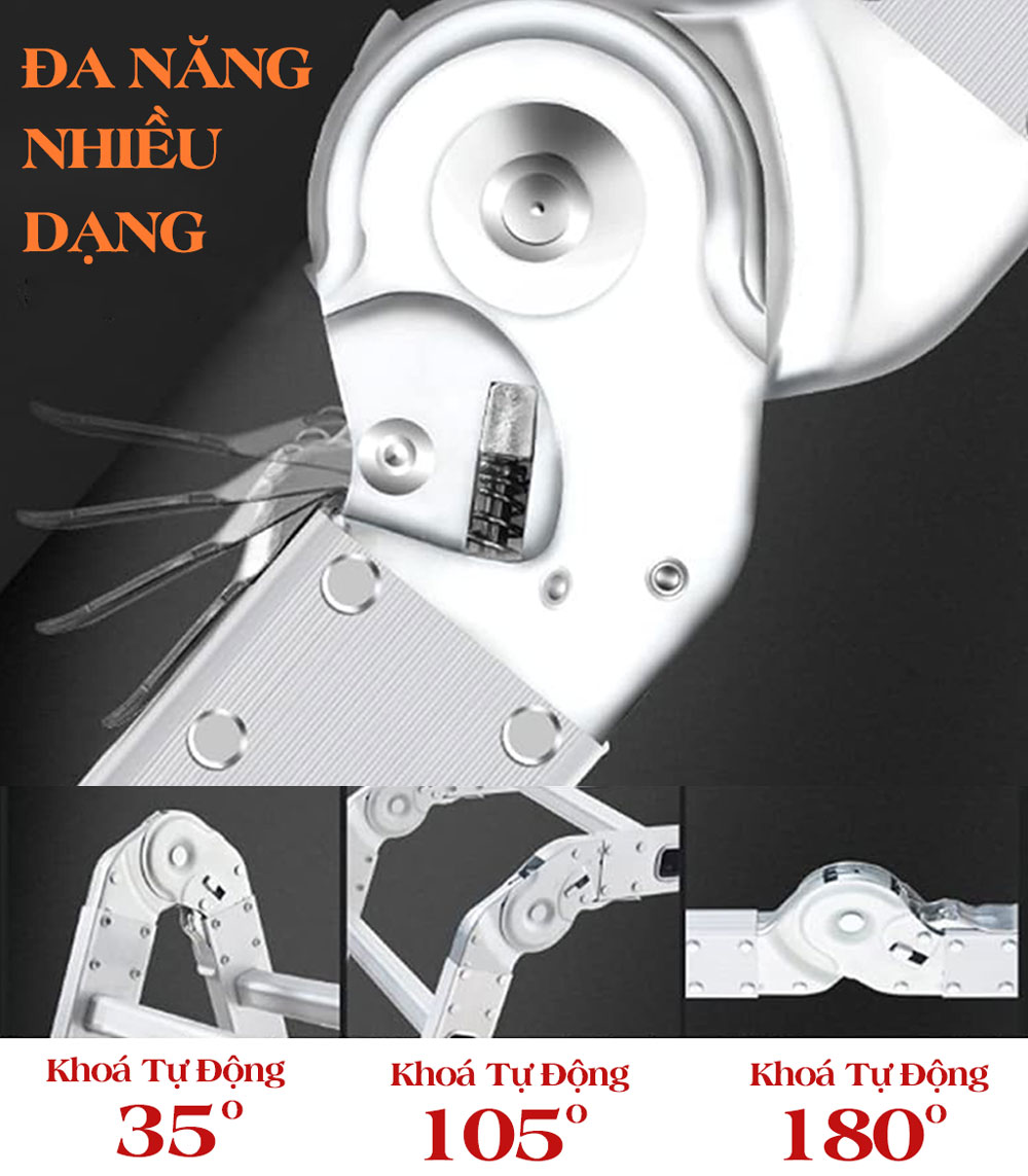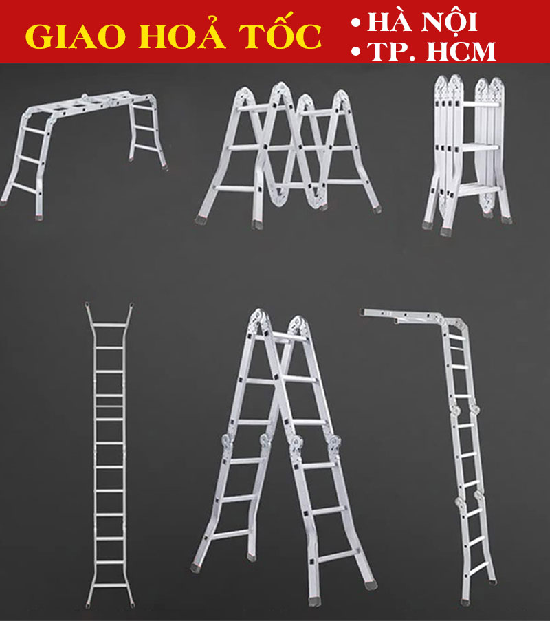 Kiểu dáng: Thang nhôm gấp làm 4 đoạn, sử dụng được nhiều kiểu dáng: chữ A, duỗi thẳng chữ I, chữ M, U, L. Xếp gọn khi không sử dụng.