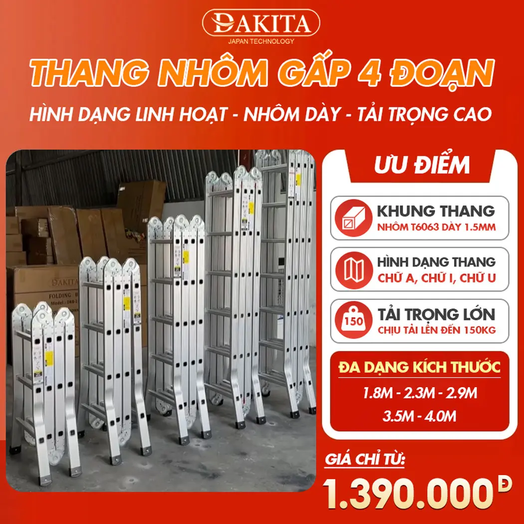 Tên sản phẩm: Thang Nhôm Gấp 4 Đoạn DAKITA Model DKT – Thang Nhẹ, Nhôm Dày, Thang Đa Năng Linh Hoạt Nhiều Kiểu Dáng