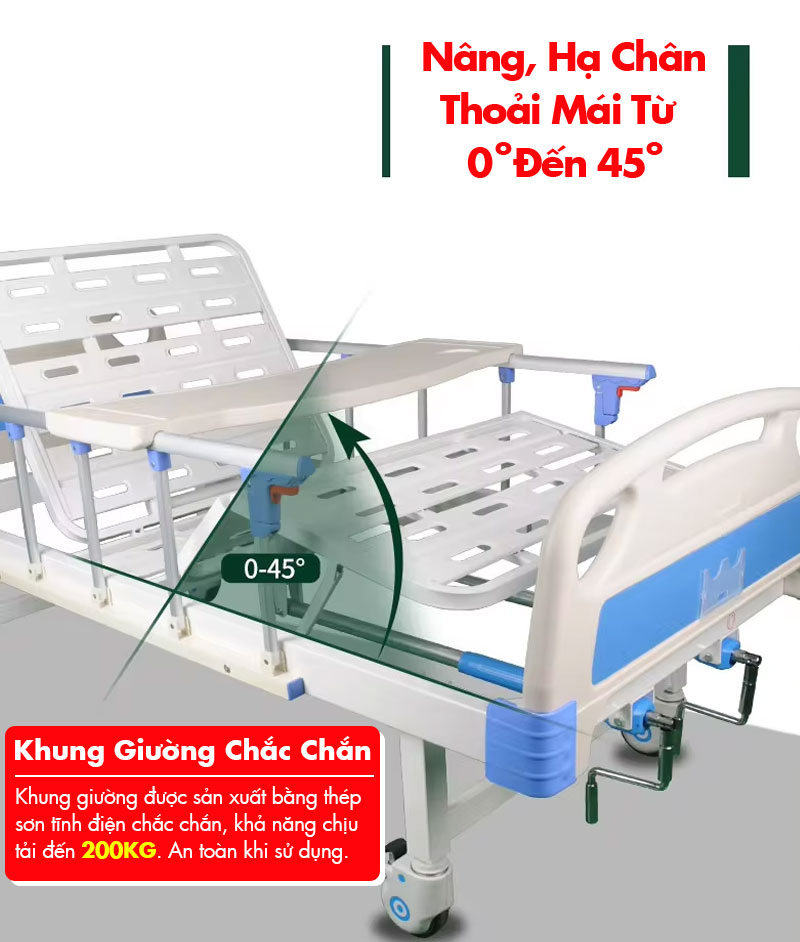 – Nâng và hạ đầu từ 0 đến 80 độ. Nâng, hạ chân từ 0 đến 45 độ. 3 Tay quay hoạt động theo từng chế độ riêng biệt.
