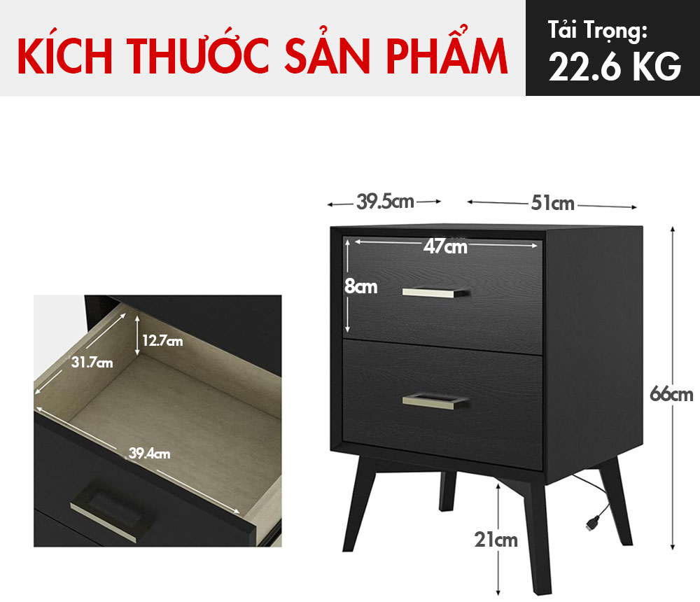 - Tiết kiệm không gian với kích thước chuẩn: Dài 51cm x Rộng 40cm x Cao 66cm phù hợp với mọi không gian phòng ngủ.