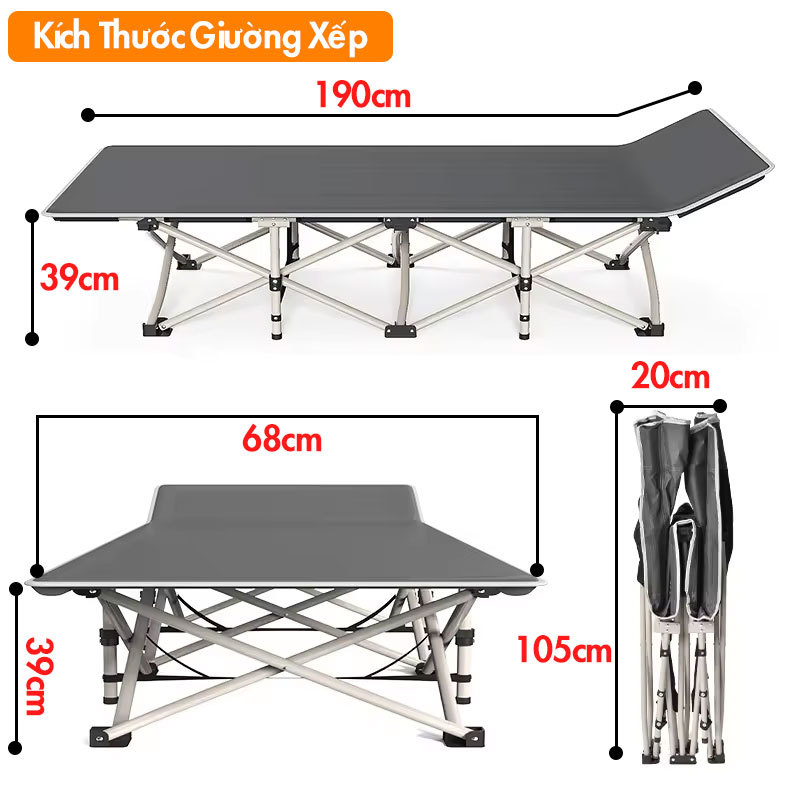 + Kích thước gấp gọn: Chiều dài 1.05m; Chiều rộng 0.68m; Chiều dày 0.2m