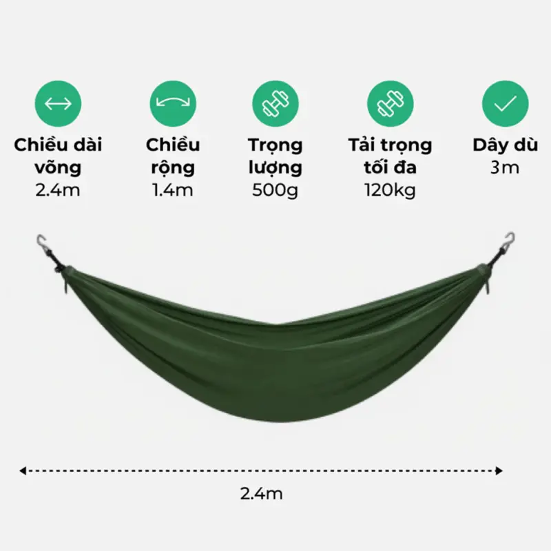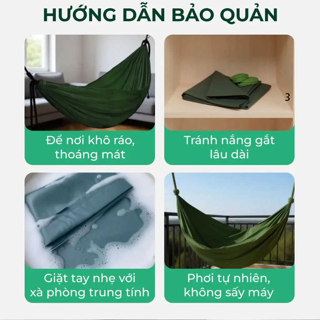 – Dễ vệ sinh và bảo quản: Chất liệu dù dễ lau chùi và nhanh khô, giúp việc vệ sinh võng trở nên thuận tiện. Người dùng có thể giữ võng luôn sạch sẽ và mới mẻ mà không tốn quá nhiều thời gian và công sức trong việc bảo trì.