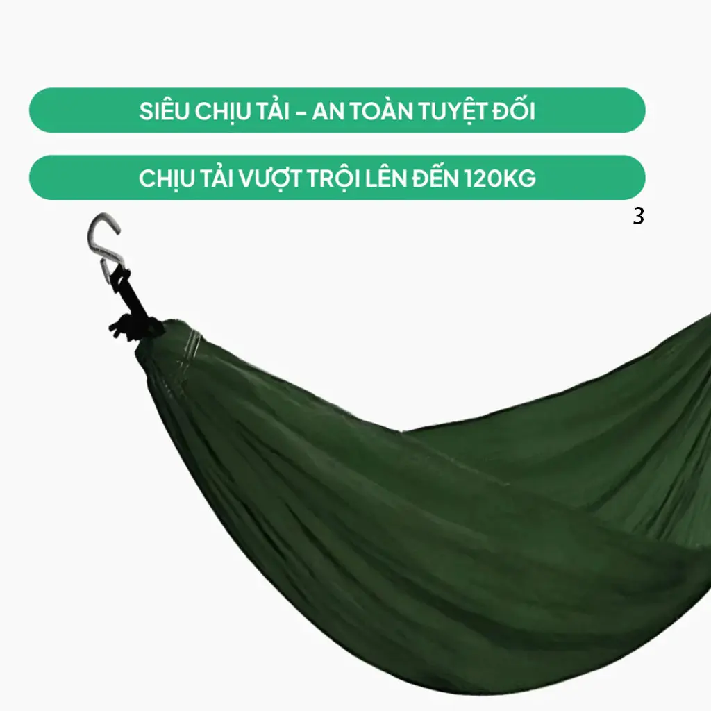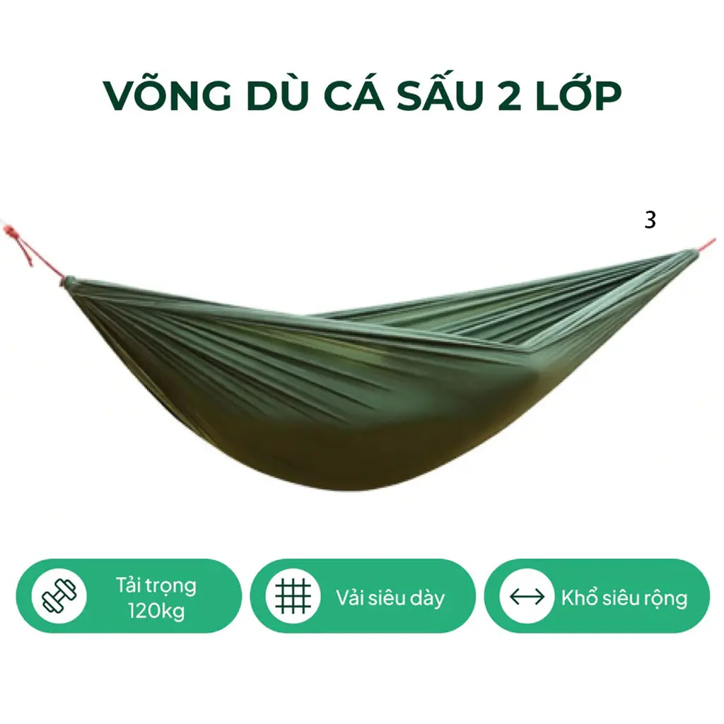 – Thích hợp cho nhiều mục đích sử dụng: Võng dù 2 lớp có thể sử dụng trong nhà, ngoài trời, trên ban công, hay trong các chuyến đi dã ngoại, cắm trại, đáp ứng nhiều nhu cầu khác nhau của người dùng.