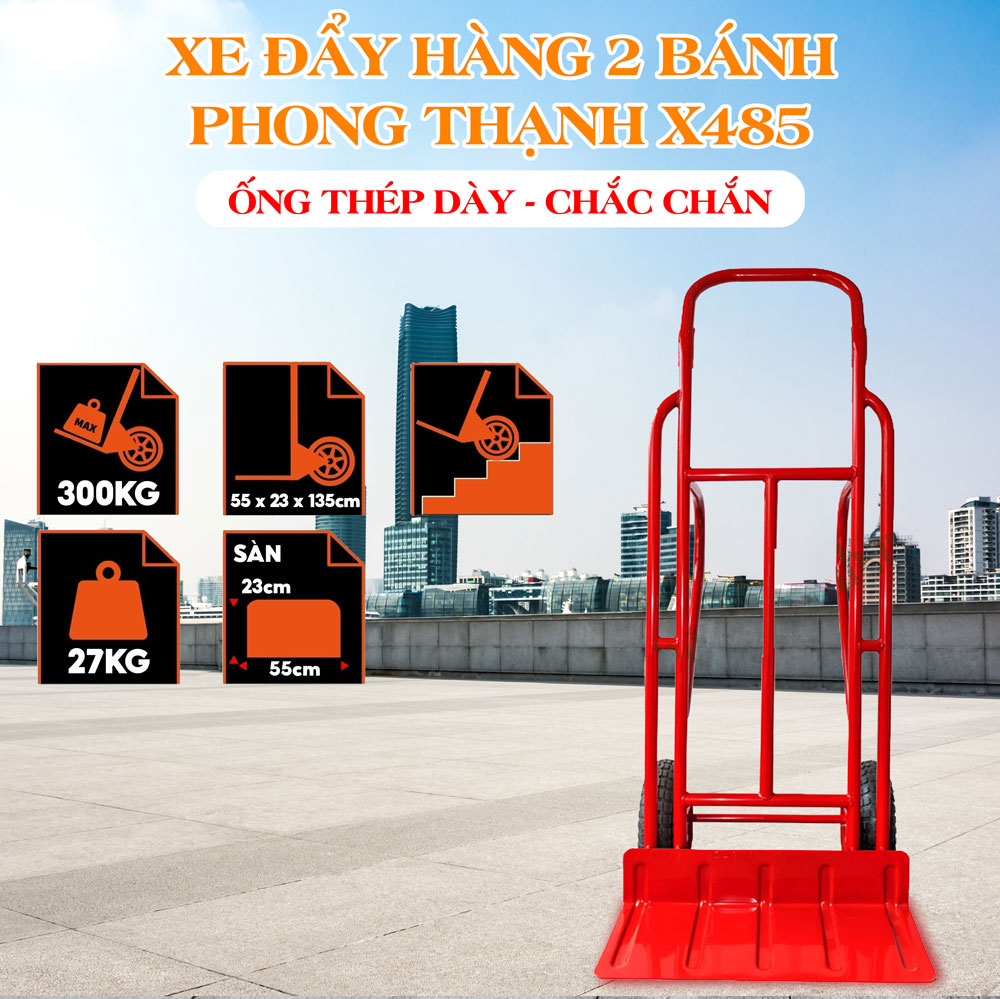Xe đẩy hàng 2 bánh X485 mẫu xe đẩy hàng 4 bánh gấp gọn của Phong Thạnh, kích thước dài 135cm, rộng 56cm, tải trọng 300kg.