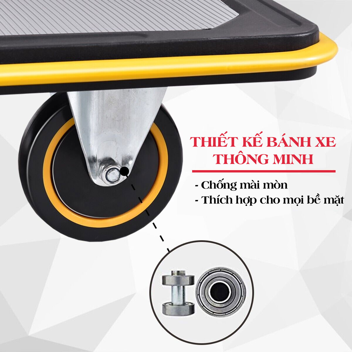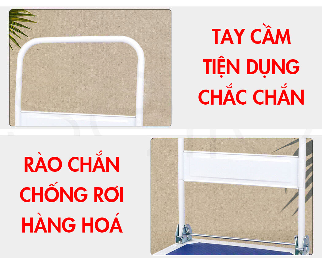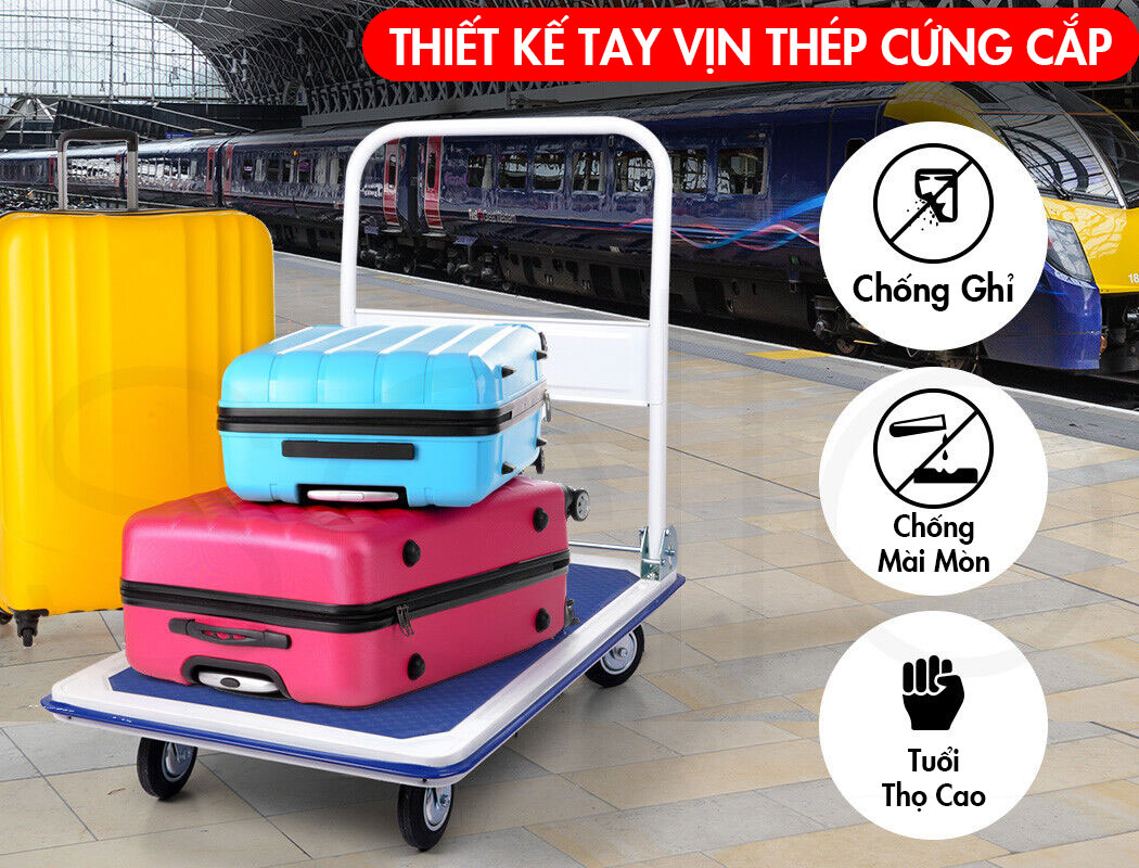 Ưu điểm: Xe đẩy nhẹ, Bánh xe PU loại tốt, càng bánh xe thép dày, đẩy nhẹ, Sàn nhựa dày chịu tải tốt bền bỉ theo thời gian, có thể gấp gọn khi không sử dụng.